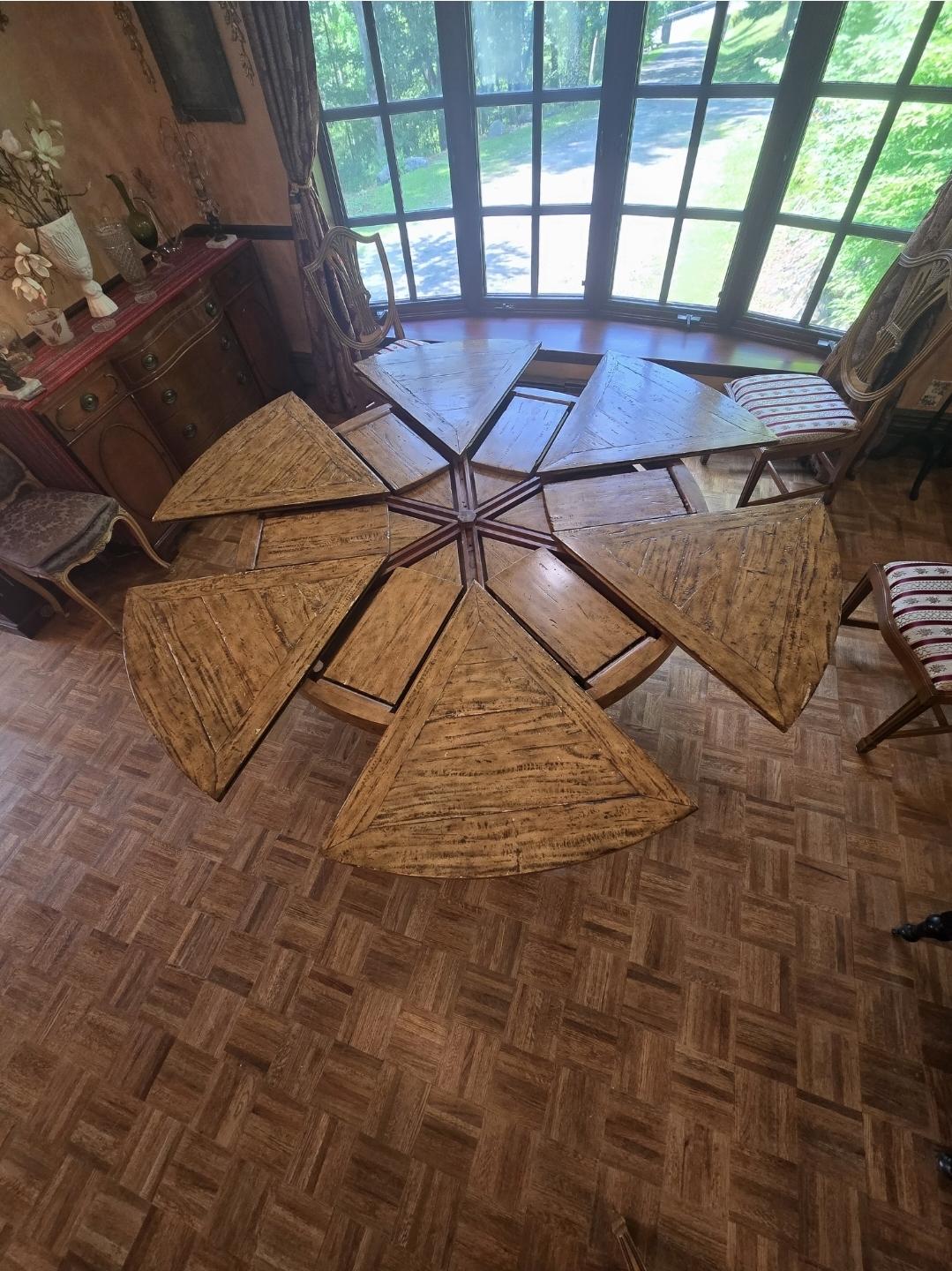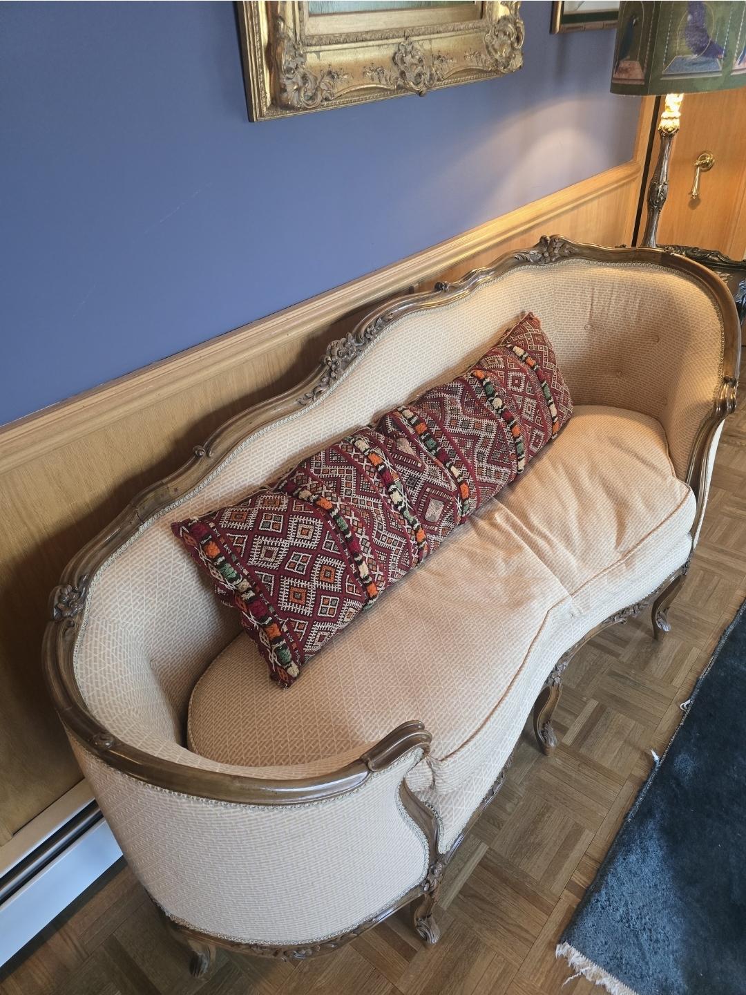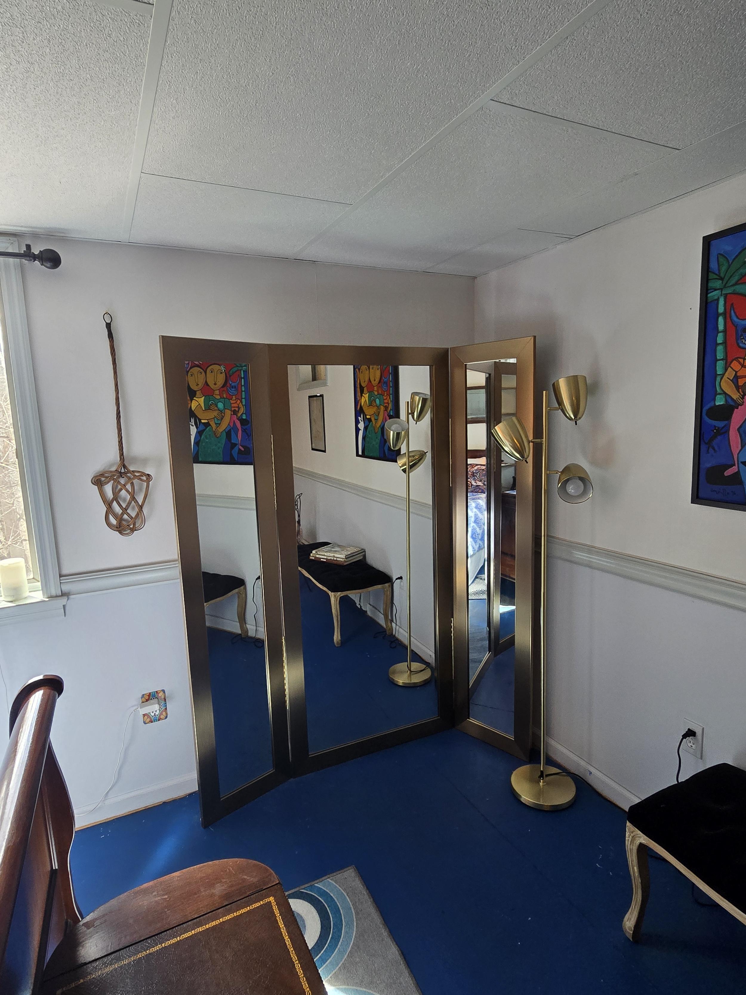 Gold tone metail frames with 3 full size mirror panels. Can also be used a room divider.